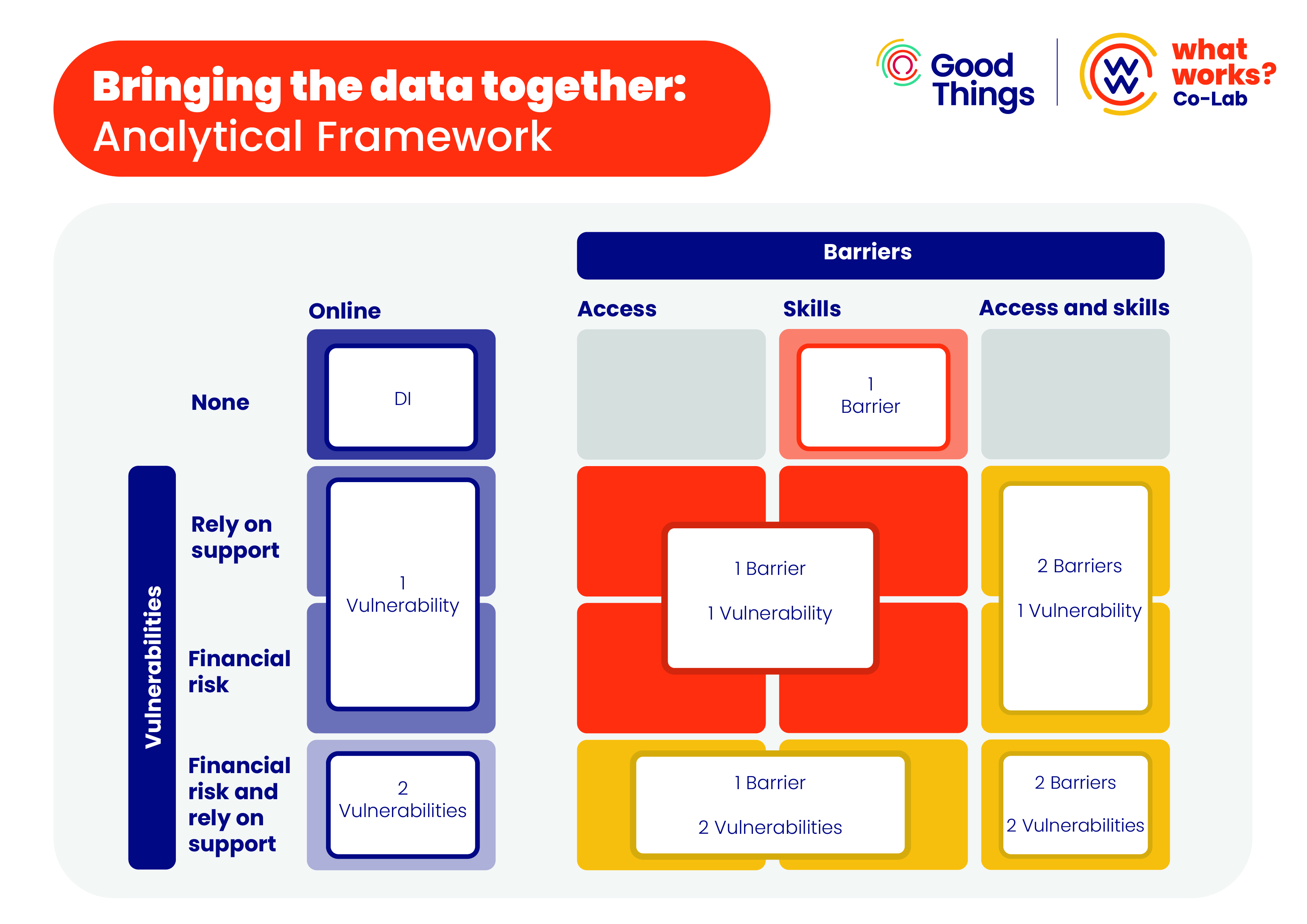- 2 Barriers, 2 Vulnerabilities: the cell in the bottom right corner corresponds to Vulnerabilities: Financial Risk and Rely on Support; Barriers: Access and Skills. This is the highest level of digital exclusion on the matrix.