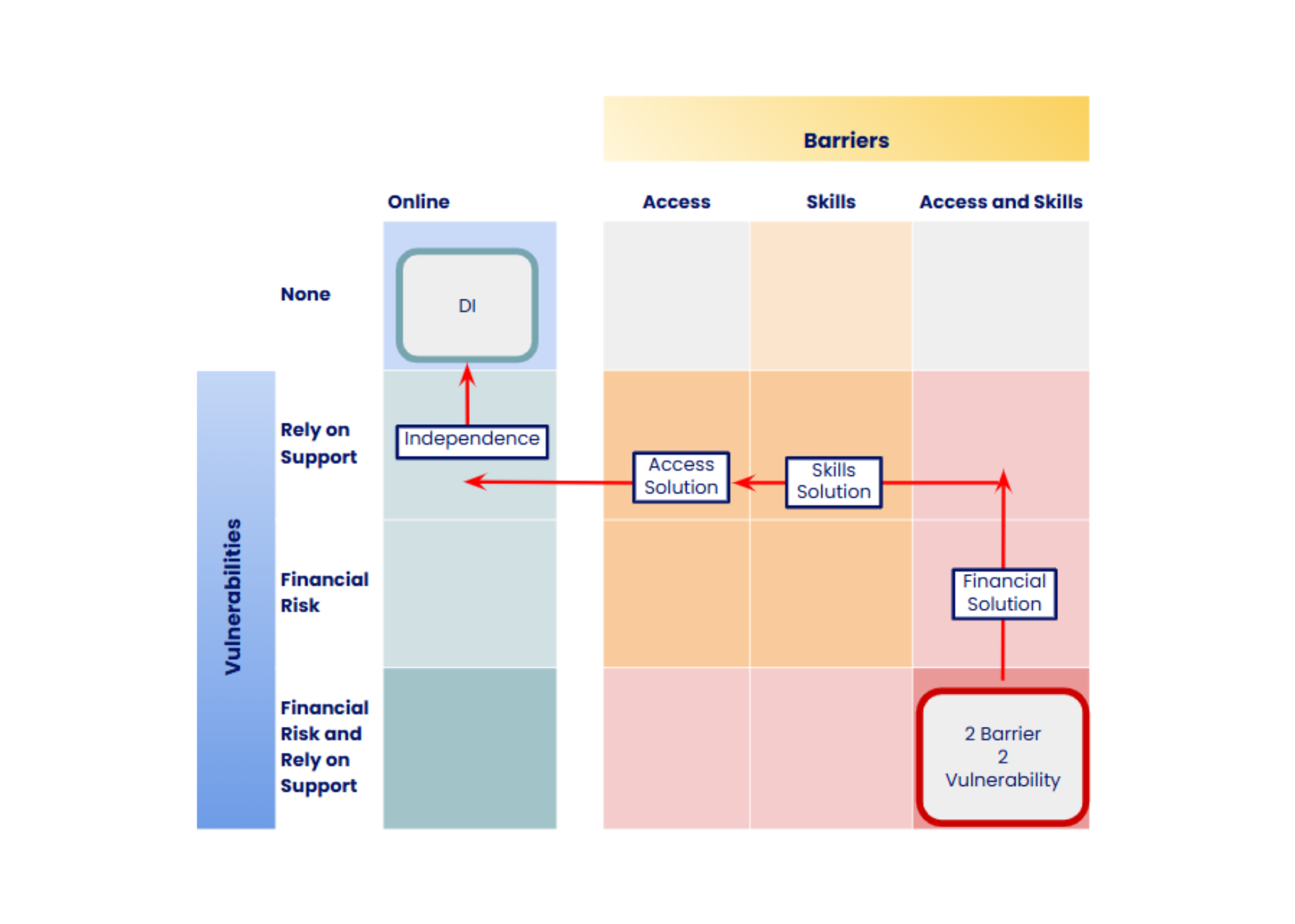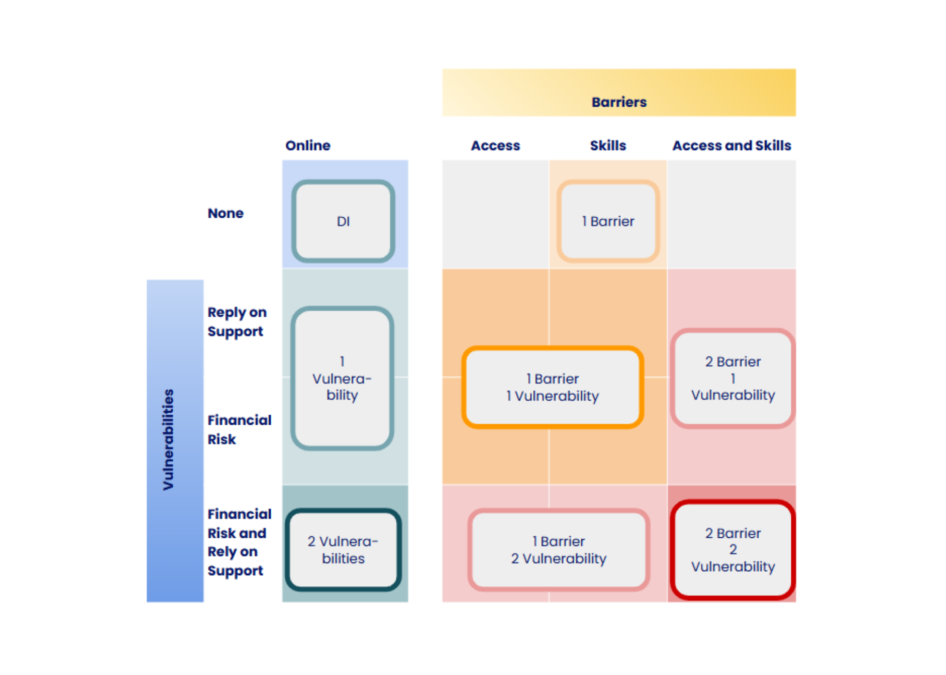 - DI [Digital Inclusion]: the cell in the top left corner corresponds to Vulnerabilities: None; Barriers: Online. This is the lowest level of digital exclusion on the matrix.