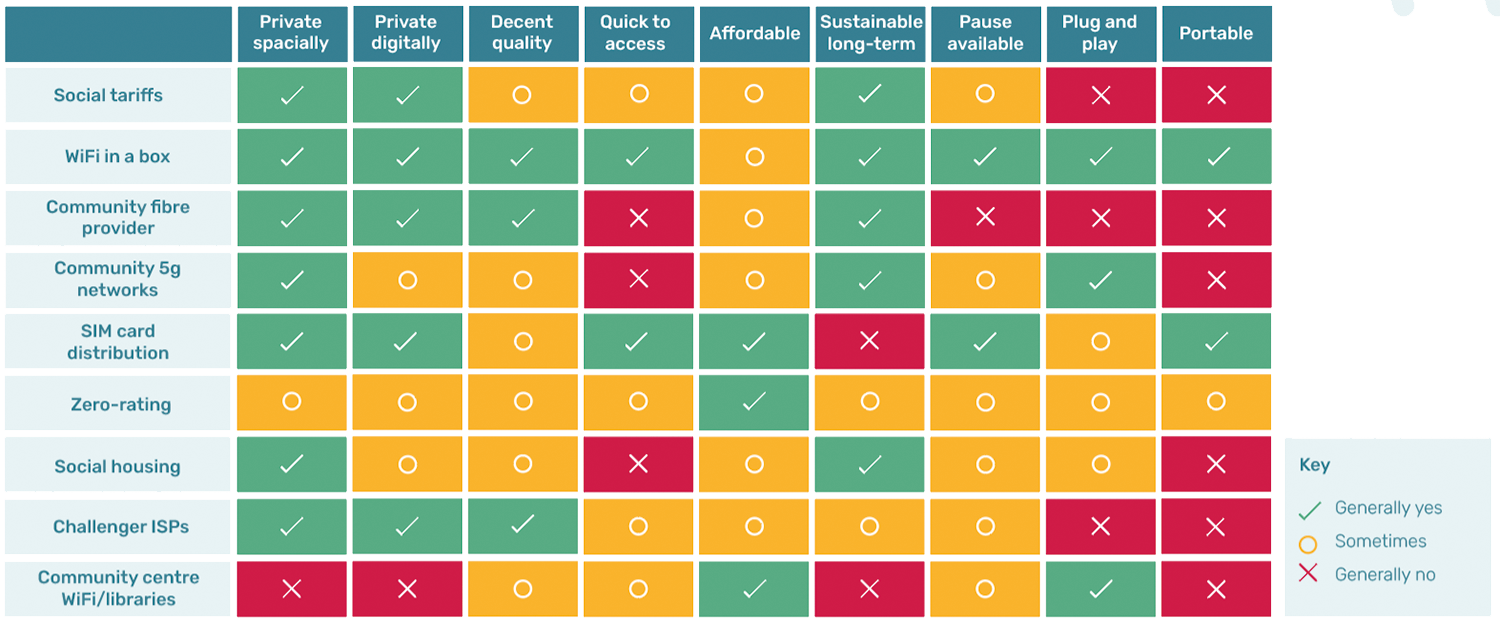 4. Strong solutions to data poverty exist in the UK and some are ripe for scaling. This research details nine solutions to data poverty, offering their pros and cons and how they might be scaled. It offers a framework for comparing solutions, specifically focused on the needs of individuals disproportionately affected by data poverty. This framework can help us understand solutions now and in the future, as technology evolves.